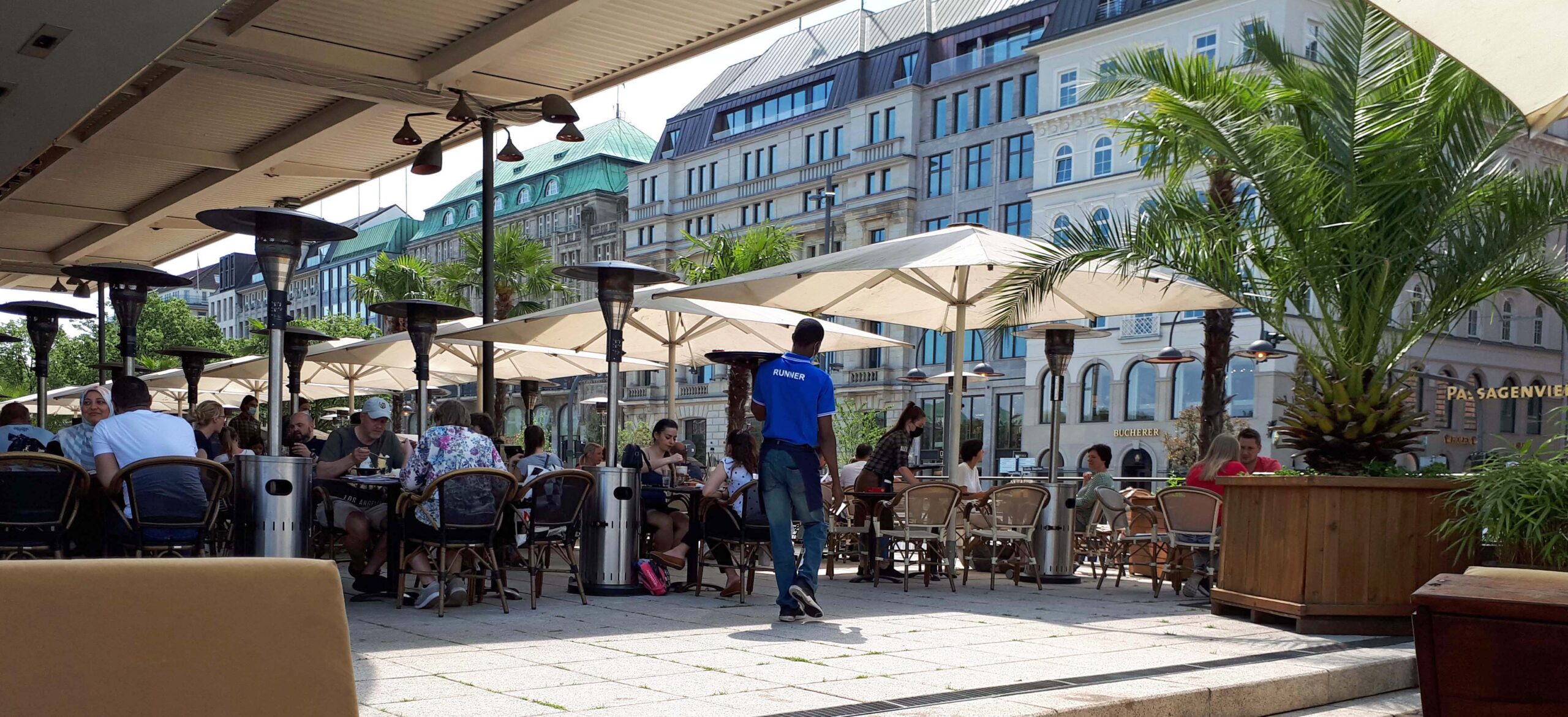 Am ersten Juni-Wochenende mit hochsommerlich warmen Temperaturen konnte man nach langer Zeit einmal wieder viele Menschen in der Hamburger Innenstadt und im Bereich der Alster sehen. Die Gastronomie hatte nun auch im Innenbereich wieder die Erlaubnis unter strengen Auflagen zu öffnen und so war es für Gäste wie Gastronomen ein lange vermisstes Erlebnis, nach der langen Zeit des Lockdown so etwas wie einen ersten Schritt für eine Rückkehr zur Normalität zu spüren.