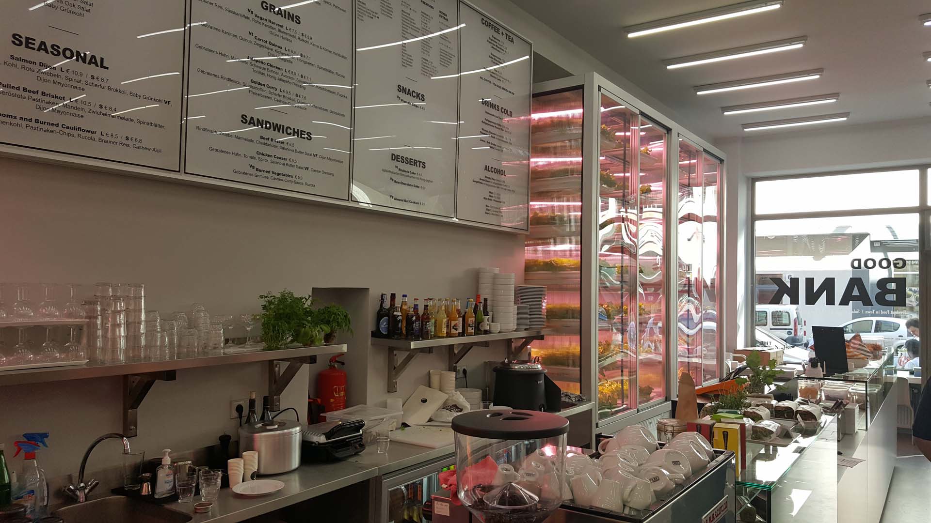 Good Bank ist das erste Restaurant, das mit Vertical Farm Anzucht-Schränken des Startups InFarm in Berlin einen Eindruck vermittelt, wie sich Pflanzenforscher, Roboterspezialisten, Industriedesigner und Futuristen die Gastronomie der Zukunft vorstellen.