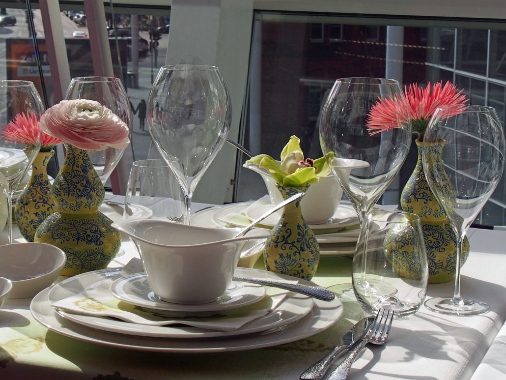 Blumen oder andere Dekoration sollten frisch und ansprechend sein und einen angemessenen Raum einnehmen. Grundsätzlich eher weniger Deko einsetzen, damit der Tisch nach dem Eindecken nicht zu voll wird und die Deko-Elemente nicht im Weg stehen. Niemandem sollte etwas im Blickfeld stehen, denn das stört, wenn man sich mit seinem Gegenüber unterhalten will. Auch Kerzen sollten sicher stehen, ohne dass sie Gefahr laufen, umzufallen.
